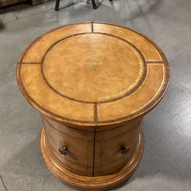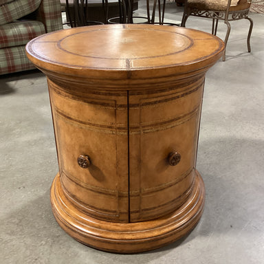 Description: Wood & Leather Gold Embossed 2 Door Round End TableCondition: Back Hole