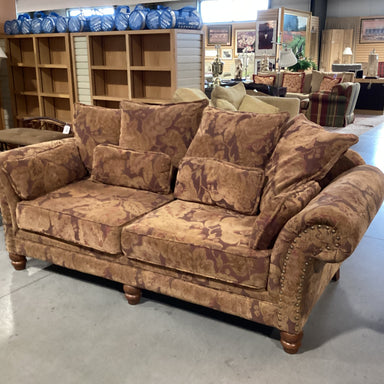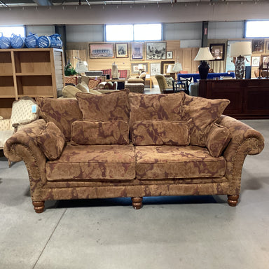 Description: Bernhardt New Vintages Gold Brown Raised Floral Nailhead SofaCondition: Some Upholstery Wear