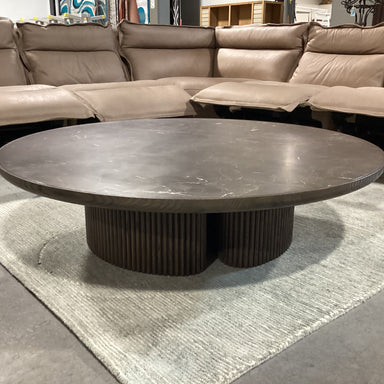 Description: Aster Dark Finish Faux Stone & Ribbed Wood Pedestal Round Coffee TableCondition: Great, Slight WearDetails: Retails $4,100 - On Sa...