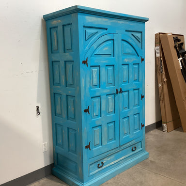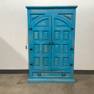 Description: Rustic Carved Pine Distressed Blue 2 Door with Shelves 1 Drawer Armoire Condition: Great, Solid Piece, Purposeful DistressingDetails: ...