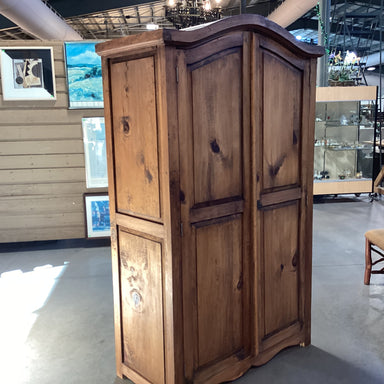 Description: Rustic Carved Solid Pine 2 Door With Shelves & 2 Drawer ArmoireCondition: Door Doesn't Shut Correctly