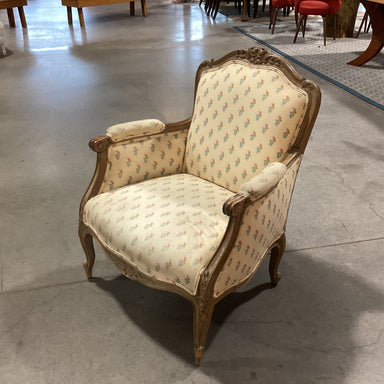 Description: French Provincial Style Carved Wood with Yellow Floral ChairCondition: Wear & Stains