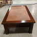 Description: Distressed Finish Carved Wood & Wicker Raffia Woven Inset Top 6 Drawer Coffee Table