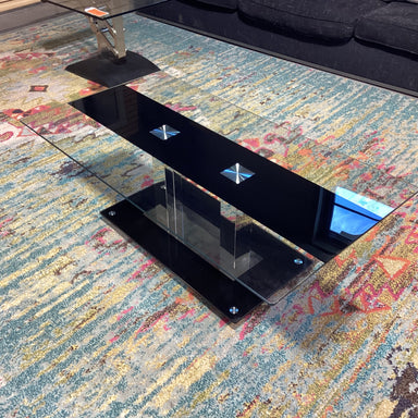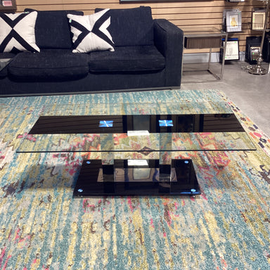 Description: Clear Glass with Black Stripe & Chrome Coffee TableCondition: Slight Wear Scratches