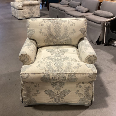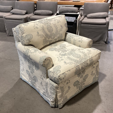 Description: Custom Cream Blue Floral Linen Down ChairCondition: Great, Slight WearDetails: Donor Valued at $2,750, No Extra Fabric Available
