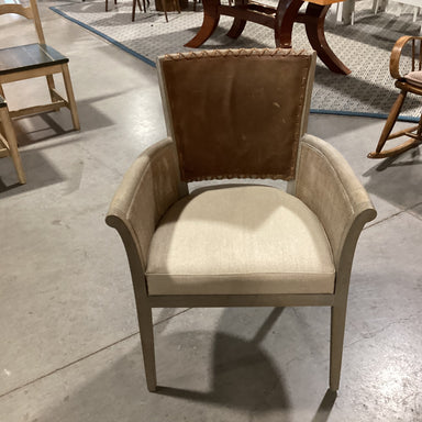 Description: Washed Grey Wood Woven Sides Leather Back Linen Seat ChairCondition: Some Leather Scratches