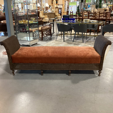 Description: Vintage Antique Wicker & Rust Chenille Woven BenchCondition: Wear Consistent with Age