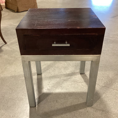 Description: Dark Distressed Wood & Square Bar Steel Base 1 Drawer End TableCondition: Wood Wear & Scratches