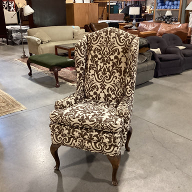 Description: Custom Cream Brown Scroll Floral with Carved Legs Highback Wing ChairCondition: Some Wood Scratches, Few Stains