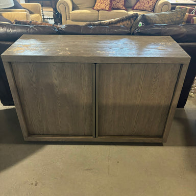 Description: Restoration Hardware Solid Grey Finished Wood 2 Door ConsoleCondition: Heavy Top Finish Wear & Some Chips