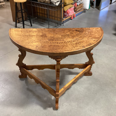 Description: Antique Ornate Carved Wood & Inlay Demi Lune Accent TableCondition: Wear Consistent with AgeDetails: Antique Valued at $3,600