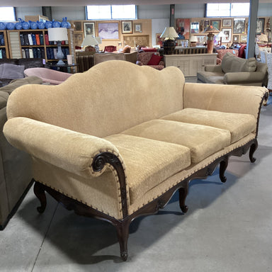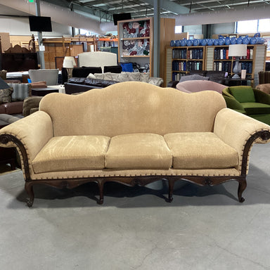 Description: Ralph Lauren St Germain Venetian Gold Chenille Woven Nailhead & Ornate Carved Wood Sofa Condition: Small Wear Tear, Some Stains, N...