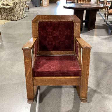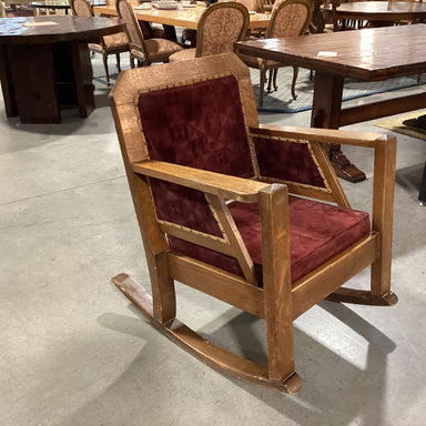 Description: Antique Oak and Burgundy Velvet Nailhead Rocking Chair Condition: GoodDetails: Wear and scratches consistent with age