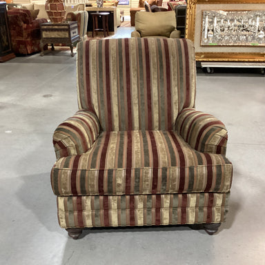 Description: Ethan Allen Gold Rust Olive Upholstered Striped Arm ChairCondition: Great, Slight Wear