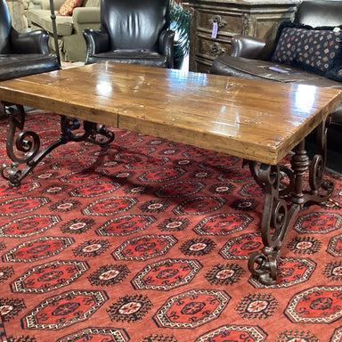Description: Rustic Distressed Solid Plank & Ornate Iron Coffee TableCondition: Some Top Scratches