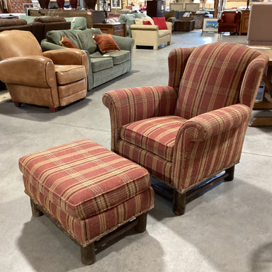 Description: French Provincial Style Carved Wood & Plaid Down with Ottoman ChairCondition: Wear & Piping FrayingDetails: Ottoman - 37"x 24"...