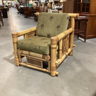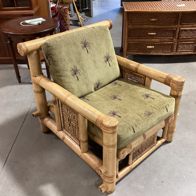 Description: Vintage Oversized Bamboo & Rattan Wicker with Palm Tree Cushions Pagoda Lounge Chair Condition: Great Condition for 1980's Vintage...