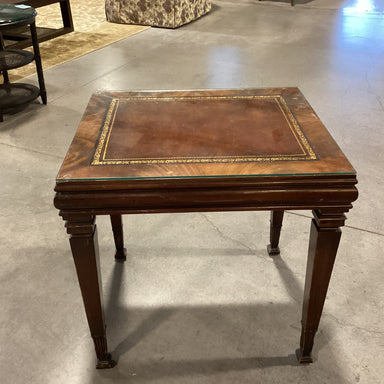 Description: Vintage Finished Carved Wood Veneer Band & Inset Leather Glass Top End Table Condition: Some Wear Marks & Finish Scratches