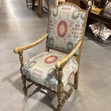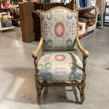 Description:Vintage Antique Carved Wood 7 Woven Floral Star Linen Nailhead Arm ChairCondition: Wear Consistent with Age