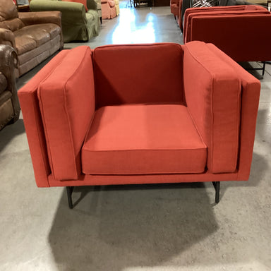 Description: Blu Dot Red Linen Modern Bank Lounge Chair Condition: Good, Slight Wear, Few Stains