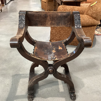 Description: Antique Dantesque Carved Walnut & Leather Chair Condition: Good, Heavy Wear Consistent with Age