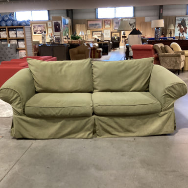 Description: Rowe Furniture Green Plush Slip Covered SofaCondition: Good, Some Wear, Loose Fit Slipcover