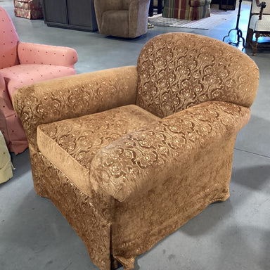 Description: JJ Custom Butterscotch & Gold Design Upholstered ChairCondition: Some Upholstery Wear