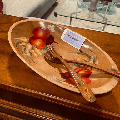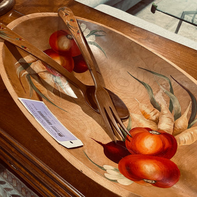 Description: Set of 3 Vintage Handpainted Beautiful Wood Oval Serving Bowl with Serving Fork and SpoonCondition: GoodDetails: 21"x 11"x 3.5"