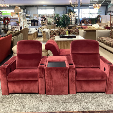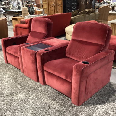 Description: Custom Claret Velvet Power Reclining Chairs with Console SectionalCondition: Right Seat Back Improper Fit Causing Gap When Fully Reclined