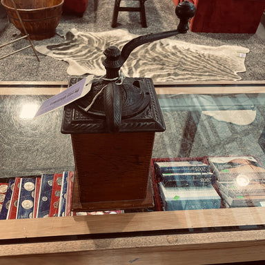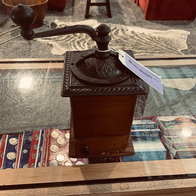 Description: Antique Handcrafted Wood Coffee Grinder with Cast Iron Ornate Cover and Hand Crank, 6.25" x 14"Condition:Details:
