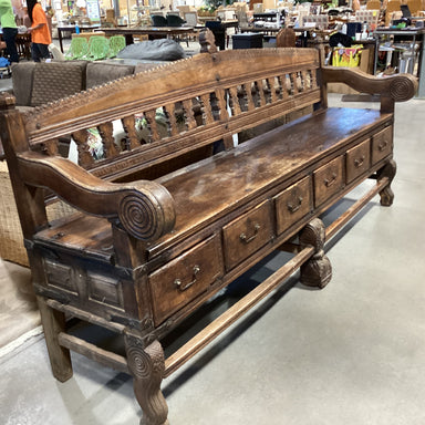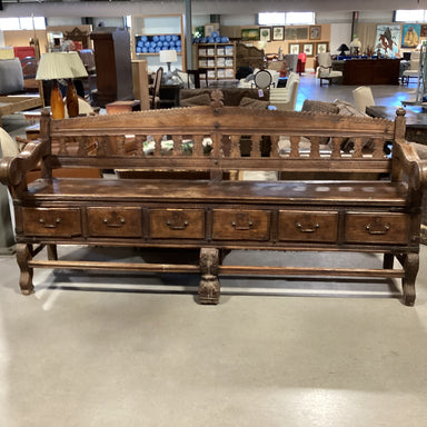 Description: Antique 18th Century Ornate Carved Wood 6 Drawer Storage BenchCondition: Wear Consistent with Age, Loose Back RailDetails: NO DELIVERY