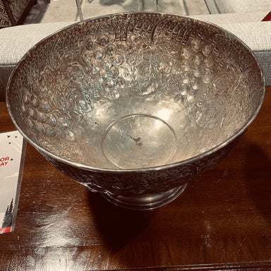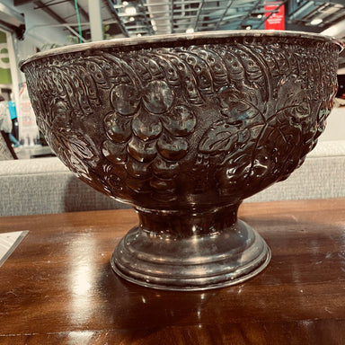 Description: Vintage Ornate Silver Plate Over Brass with Grape and Vine Motif Footed Wine Cooler/Punch Bowl, Made in India, Condition: GoodDetails:...