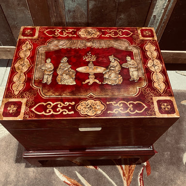 Description: Small Red/Gold Asian Trunk on Wood StandCondition: Good/Some ScratchsDetails: 16"x12"x10" Trunk, Wood Stand 7"