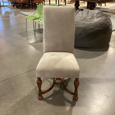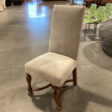 Description: Carved Wood & Dove Grey Suede Leather Chair Condition: Slight Wear