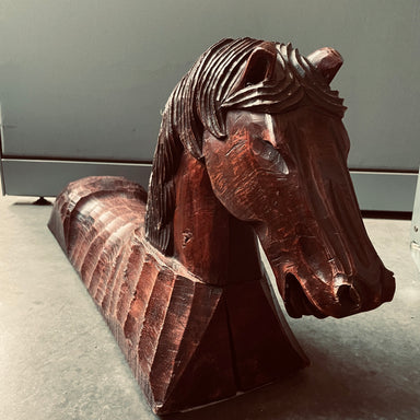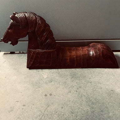 Description: Vintage Folk Art Carved Mahogany Colored Heavy Horse Sculpture, 32"x7.5"x14"Condition:Good/Some Cracks,Nicks