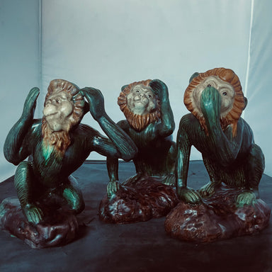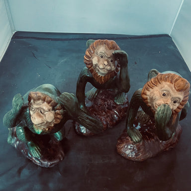 Description: Set of 3 Vintage Majolica Ceramic Monkey Figurines,Made in ChinaCondition: GoodDetails: Approximately 8" Tall