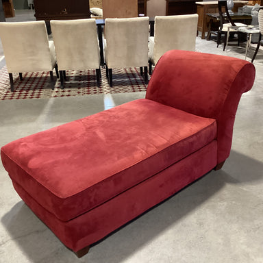 Description: Red Micro Suede Chaise SofaCondition: Piping Tear, Few Stains