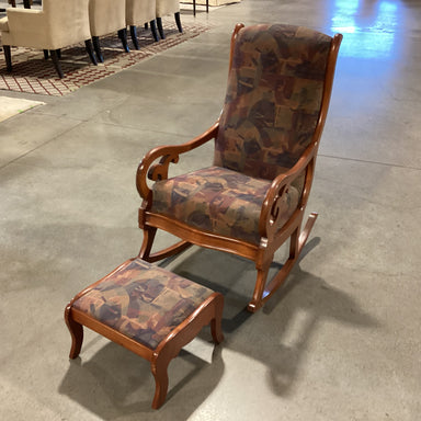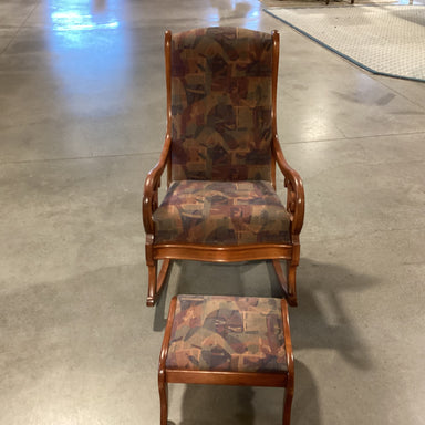 Description: Carved Finished Wood & Brown Multi with Ottoman Rocking ChairCondition: Few Finish Scratches
