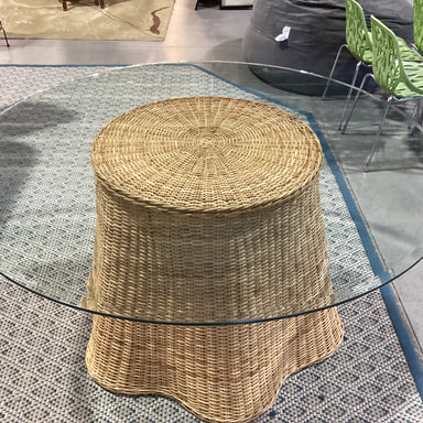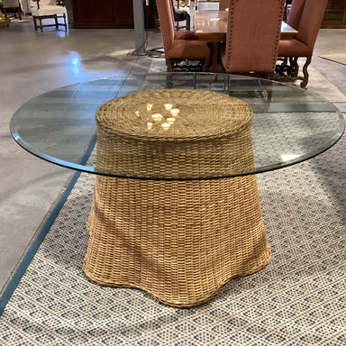 Description: Wicker Woven Base & Round Glass Dining TableCondition: Slight Wear
