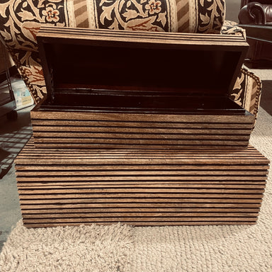 Description: Set of 2 Handcrafted Modern Wood Trinity Boxes by ArteriorsCondition: Good/Few NicksDetails: Small: 22"x6.5"x6.5", Large:24"x9 .5"x7.5"