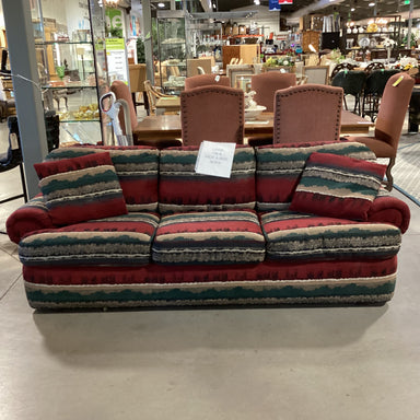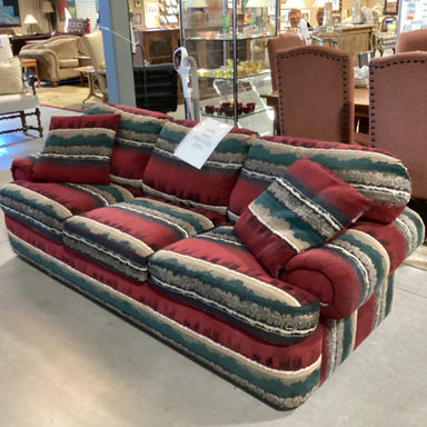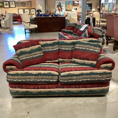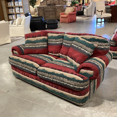 Description: Red Green Southwest Upholstered Loveseat SofaCondition: Some Wear & Stains