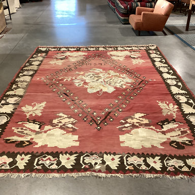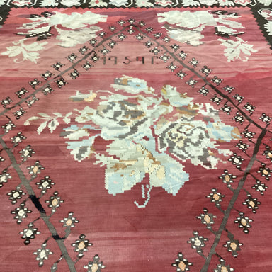 Description: Vintage 1954 Bessarabian Coral Cream Brown Hand Woven Flatweave Wool RugCondition: Wear Consistent with Age