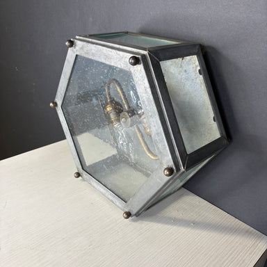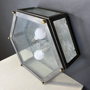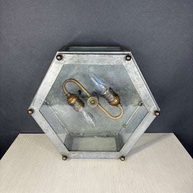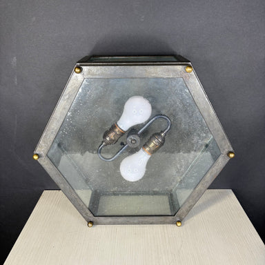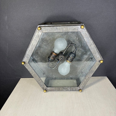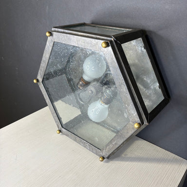 Description: Mission Hill 2-Light Hexagonal Gunsmoke Metal and Brass Flush Mount Ceiling PendantCondition: GoodDetails: Some wear