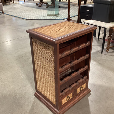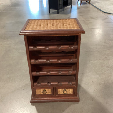 Description: Finished Wood & Wicker Woven with Wine Rack & 2 Drawers End TableCondition: Wood Wear & Scratches