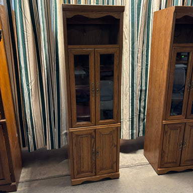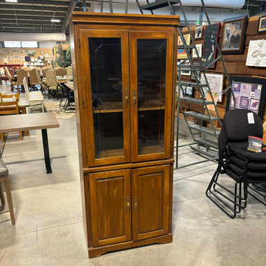 Description: Distressed Oak with Brass Accents 4 Door Lighted Display BookcaseCondition: Some Wood Wear & ScratchesDetails: No Shelf in Lower C...