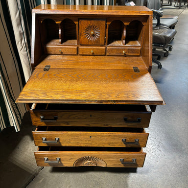 Description: Dixie Windsor Oak Collection Ornate Carved Solid Oak 4 Drawer Drop Down Secretary DeskCondition: Great, Slight Wear