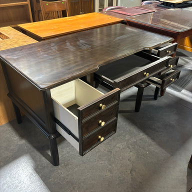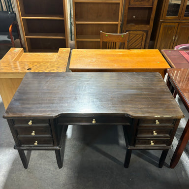 Description: Ashley Dark Finish Wood Style Laminate with Brass Colored Accents 5 Drawer DeskCondition: Wear & Laminate Chipping