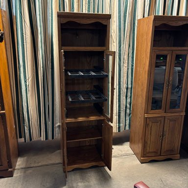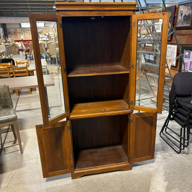 Description: Medium Finish Solid Wood with Crown Molding 2 Door Backlit Display CaseCondition: Slight Wear & Marks