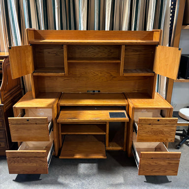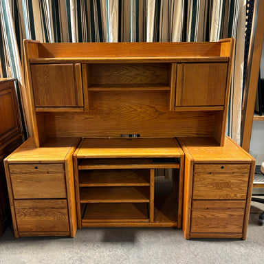 Description: Light Finish Oak 4 Drawer 2 Door & Interior Storage 4 Piece with Hutch & 2 File Cabinets DeskCondition: Slight Wood Wear