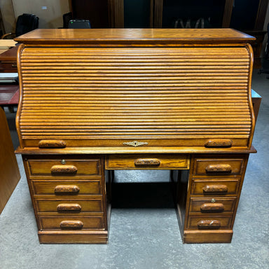 Description: Medium Finish Carved Oak with Brass Accents 1 Door 3 Drawer with Center Pullout & Interior Storage Roll Top DeskCondition: Details: